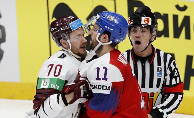Сборная Латвии в 12-й раз играла с чехами на чемпионатах мира. Прежде лишь в трех встречах латвийцам удалось забросить более одной шайбы. Казалось, результативный первый период добавит латвийцам уверенности и позволит побороться за историческую победу, но в начале второго периода Марис Бичевскис толкнул Ржепика в борт и получил «5+20». Справедливости ради, нужно сказать, что нарушение было, но на удаление до конца матча оно не тянуло. Тренер сборной Латвии Боб Хартли пришел в ярость от судейского решения, орал и пытался что-то доказать арбитру, но тот остался непреклонным. Сборной Латвии пришлось пять минут играть в меньшинстве.