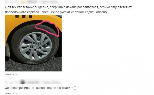 «Каркас шины торчит наружу. В любой момент колесо может бахнуть, а тк это переднее, то это потеря управления», - со знанием дела прокомментировали пост пользователи Сети. Не исключено, что рискуя попасть в ДТП со смертельным исходом. Таксисты стараются «уйти в плюс», ведь из-за ценовой политики «Яндекс.Такси» им приходится работать по 12-14 часов. В большинстве случаев, за обслуживание машины отвечают сами водители, поэтому и не спешат ее ремонтировать – ведь это солидная статья расходов.