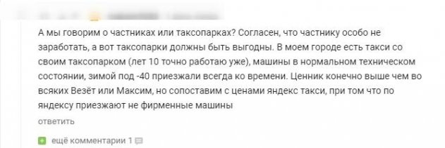 Многие комментаторы также пришли к выводу, что гонорары для водителей от агрегатора настолько низкие, что нет денег даже на новые шины, остальные же заявили, что шоферы просто очень жадные, и сколько бы им не платили, они все равно «будут экономить на спичках». Один из ораторов заявил, что клиентам не стоит рисковать ездить на машинах от «Яндекс.Такси», «Максим» или «Везет», а лучше доверять городским таксопаркам. Там, дескать, хоть и цены дороже, зато машины приезжают качественные и прошедшие техосмотр.