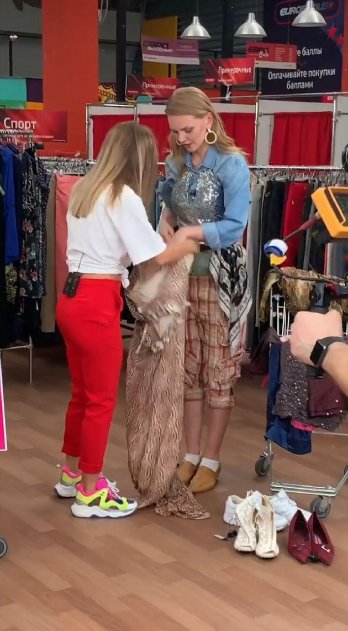 Даже во время записи эфира профессиональная актриса не смогла переступить через себя и примерить хотя бы одну из вещей - лишь кончиками пальцев гадливо держала босоножки и помогала примерять одежду своей напарнице, модели Елене Кулецкой, которая полностью погрузилась в съемочный процесс и с удовольствием и весельем начала надевать понравившиеся вещи высмеивая свои неудачные образы.