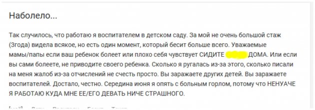 Воспитатель пожаловалась, что в середине июня она опять ушла на больничный по причине больного горла. По ее словам, мамы руководствуются мыслью: «Я работаю, мне девать ребенка некуда. Ничего страшного».