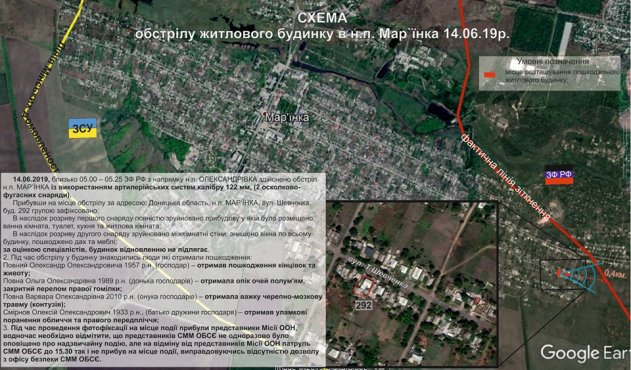 «В п’ятницю, 14 червня, близько 5 ранку, збройні формування Російської Федерації з напрямку населеного пункту Олександрівка здійснили обстріл міста Мар’їнка, застосувавши ствольну артилерію калібру 122 мм, зокрема 2 осколково-фугасних снаряди. В наслідок влучання двох снарядів суттєво пошкоджено житловий будинок, за оцінкою спеціалістів відновленню будова не підлягає», — ідеться у повідомленні.