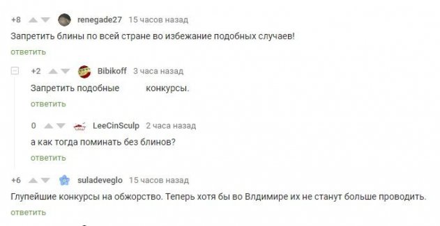 В основном большинство пользователей осудили данный конкурс и предложили запретить его, потому что чемпионаты по поеданию не являются исконно русской традицией.
