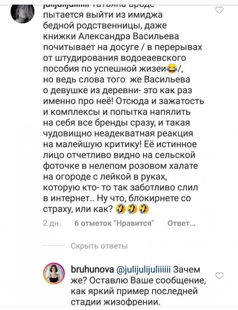 Брухунова ответила: «Зачем же? Оставлю Ваше сообщение, как яркий пример последней стадии жизофрении». Судя по всему, Татьяна привыкла к таким нападкам и с чувством исполненного долга грубо ответила хэйтерам на попытку высмеять ее стиль, но подписчицу все-таки отправила в бан. Но, большинство пользователей сошлось во мнении, что Татьяна умело играет роль одного актера в Большом театре.