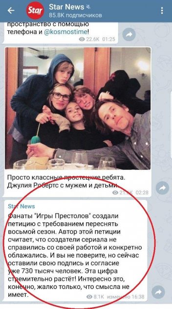 По информации в Телеграм-канале, Star News свою подпись и согласие переснять сериал дали более 730 тысяч человек. Бурная реакция поклонников, несомненно, интрирует наблюдать за дальнейшими событиями, но если и наберут необходимое количество голосов, то скорее всего это ни к чему не приведёт. Даже, если бы чудным образом пересняли восьмой сезон, то многие бы отказались от просмотра.