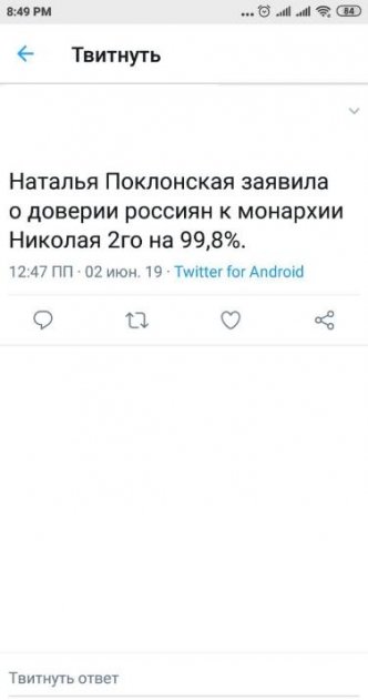 Стало известно, что Наталья Поклонская, депутат Госдумы, в одном из своих высказываний упомянула, что царский режим Николая II поддерживают 99,8% россиян. К чему была приведена данная статистика – неизвестно, но, по всей видимости, женщина попыталась в очередной раз подчеркнуть святость и чистоту императора, которого «вероломно убили большевики». Или же, наоборот, говорила именно о якобы приверженности россиян к монархии.