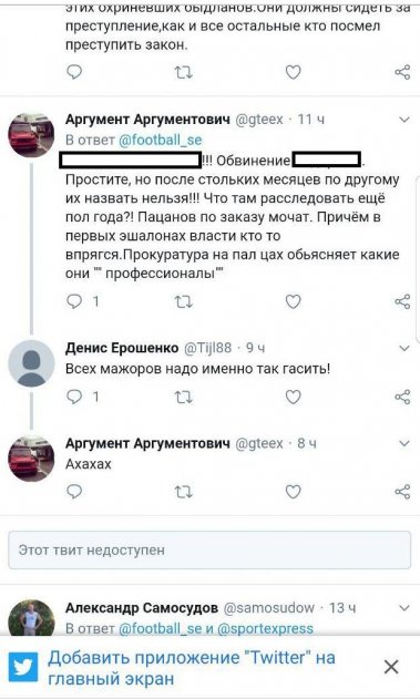 «Простите, но после стольких месяцев, что там расследовать еще полгода? Пацанов по заказу мочат! Причем, кто-то в первых эшалонах власти впрягся», - пишут подписчики в Twitter группе «СЭ Футбол РПЛ».