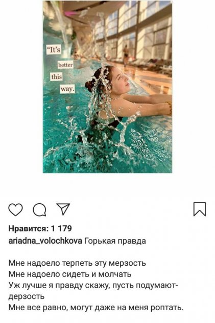 Проблемы с мамой явно существуют, подозревают подписчики, ведь девочка всеми способами пытается «достучаться» до сердца матери через душераздирающие посты или же «глубокую» поэзию. Так недавно, дочь Волочковой поделилась гневным стихотворением в сети, которое могло задеть балерину: «Мне надоело терпеть эту мерзость Мне надоело сидеть и молчать Уж лучше я правду скажу, пусть подумают - дерзость Мне все равно, могут даже на меня роптать. Не могу смотреть я на людей, кому так важен выпендреж Лучше будут они ужасны и характер как лёд Меня от этих не так бросает в дрожь Их можно понять, может жизнь их не сладка как мед. Но люди, что ходят, кричат, что Гуччи Кричат, что прекрасны, хотя в реальности - полная ложь Вот они на меня нагоняют тучи Такие способны воткнуть в сердце нож. Но главное нечем на самом-то деле гордиться Есть кроссы от Balenziaga и Louis Vuitton Да, небогатым это может только присниться Зато у этих есть душа, вот для понтовых, что на самом деле сон. У них много денег, а может есть и Versace Бежав на встречу и рукой маша Задумайтесь, таких людей безумно много, кучи Подумайте, есть ли у них душа? Ариадна Волочкова. У кого-то другое мнение и это нормально, просто я говорю здесь то, что думаю и имею право».