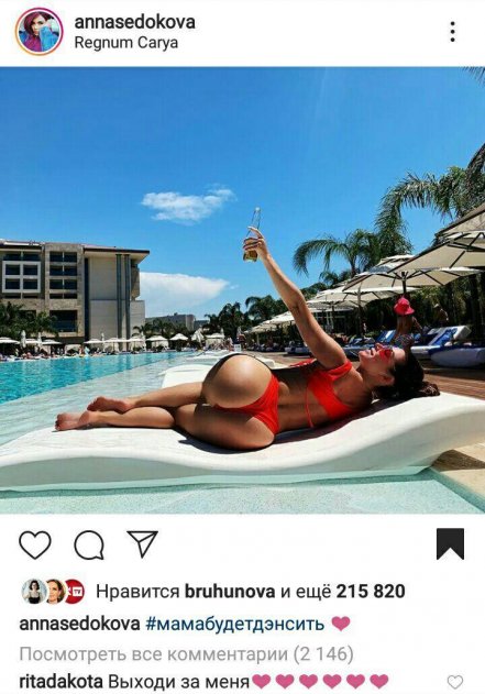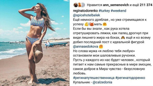 Позже, другая певица Регина Тодоренко жестко простебала «идеальную» фигуру Анны Седоковой, кинув «камень в её огород». «Ещё немного дряблая, но уже стремящаяся к успеху мать Если бы вы знали , как рука хотела отретушировать ляжки, как палец дрогнул при виде лишнего жира на боках, ещё и ко всему добил последний пост с идеальной фигурой @annasedokova Но слова мужа «я люблю тебя любую» остановили мои шаловливые ручонки. Пусть у каждого из нас будет человек, который питает к нам самые прекрасные в мире эмоции, самое доброе в Мира чувство - безусловную любовь», - написала Регина.