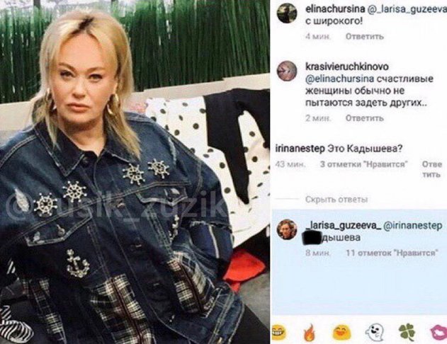 В своем Instagram телеведущая опубликовала новый снимок, на котором один из фолловеров сравнил ее со знаменитой российской артисткой Надеждой Кадышевой. Гузеева поспешила отметить в своем фирменном стиле, «срифмовав» фамилию певицы с созвучным матерным словом мужского полового органа. Публикации не осталось в профиле Гузеевой, судя по всему, она удалила ее из-за сравнения. Неужели так задело?