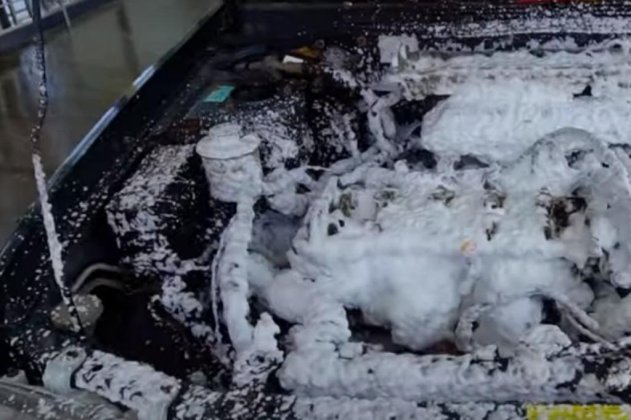 Чтобы «все сразу не заглохло», все контакты проводки под капотом обработали литолом, после чего «Ниссан» завели, загнали в моечный бокс и не глушили. Несмотря на то, что мотор работал «не ровно», испытание активной пеной и водой при внешней помывке он выдержал. Но ведь экспериментаторы не были намерены сдаться, и решили помыть работающий японский мотор внутри, подав пену в отверстие для залива масла, а впоследствии и средство от насекомых. «Досталось» также ГУРу и рулевой рейке.