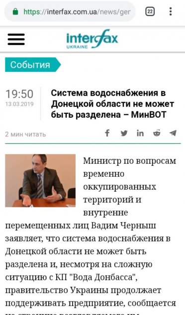 «А дело вот в чем: в ОРДЛО у РФ по сути 2 больших проблемы. Питьевая вода, которую фактически нельзя пить [вспомните про отравления в Макеевке и в других городах]. Причина загрязнения воды проста — наплевательское отношение к экологии со стороны и РФ, и коллаборантов. Вторая проблема — это то, что пропаганда РФ будет использовать раскрученную тему с водоснабжением для возможного наступления и выхода на границы Донецкой области, это тупо обертка для повода начать масштабные боевые действия прям под выборы, и не более того.