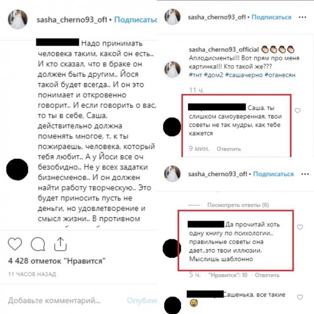 Помимо этого, ей посоветовали перестать пытаться заставить Йосю стать бизнесменом и начать работать над собой. Другие также отметили, что в настоящее время жить легче, если работает и муж, и жена, хотя Саша Черно, кажется, такой вариант даже не рассматривает.