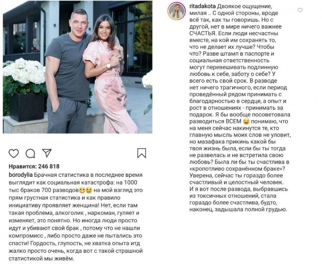 После такого заявления мнение Бородиной подверглось критики множества ее подписчиков, в их числе оказалась и певица Рита Дакота, которая в свою очередь осудила за высказывания о понятии брака: «Если люди несчастны вместе, на кой им сохранять то, что не делает их лучше? Чтобы что? Разве штамп в паспорте и социальная ответственность могут перевешивать подлинную любовь к себе, заботу о себе? У всего есть свой срок. Я бы вообще посоветовала разводиться всем».