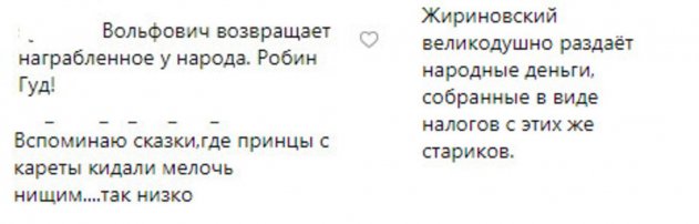 Другие же полагают, что лидер ЛДПР поступил, как Робин Гуд и частично вернул «награбленное» у народа. В этом жесте «Вольфовича» отдельные граждане даже усмотрели восстановление справедливости. Большинство назвало действия Жириновского безнравственными и не жалели эпитетов, для характеристики увиденного, выразив сожаление, что для многих россиян деньги «не пахнут».