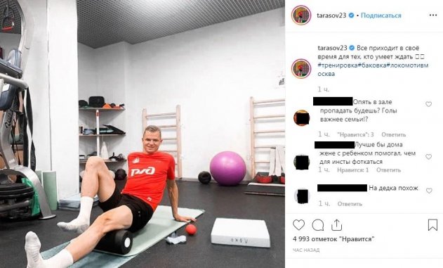 32-летний российский футболист Дмитрий Тарасов является активным пользователем социальной сети Instagram. В личный микроблог знаменитый мужчина регулярно публикует посты и кадры из своей жизни. Недавно Тарасов показал, что преступил к тренировках в сборной московского «Локомотива». Теперь поклонники опасаются, что история может повториться и Дмитрий снова «забьёт» на жену и маленькую дочь ради футбола, как это было в его первом браке. Напомним, что сейчас Тарасов состоит в третьем браке с моделью Анастасией Костенко.