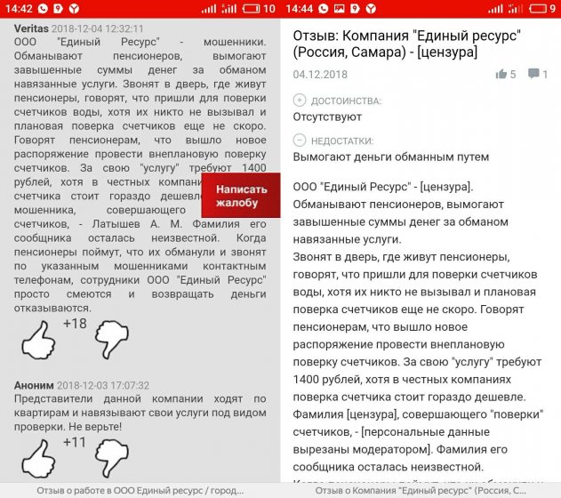Жители Волгограда в последнее время стали сталкиваться с представителями некой компании, называющей себя ООО «Единый ресурс». Судя по жалобам в сети, сотрудники ходят по квартирам, где преимущественно проживают пенсионеры или просто пожилые люди с требованием проверить счётчики воды. Они уверяют, что срок проверки вышел и владелец давно перешёл на оплату «по среднему». На возражения, что плановый регламент ещё не скоро, якобы следуют угрозы: «Откройте дверь, иначе вас ожидает крупный штраф!». Некоторые идут на поводу и сталкиваются с вероятным форменным вымоганием денег. «Проверяющие» выставляют счёт в 1500 рублей за один счётчик, а в случае, если таковых в квартире 2, то поборы вырастают до 3000 рублей.