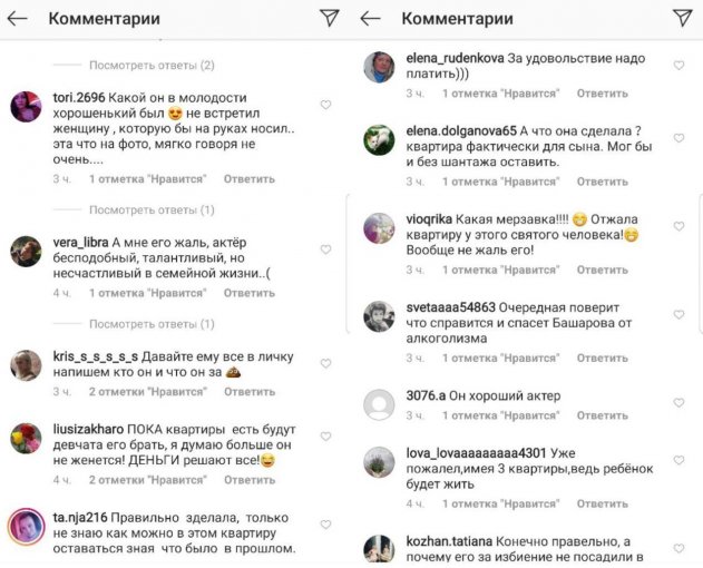 После заявления бывшей жены, Марат Башаров не стал молчать и решил пожаловаться, что Елизавета заставила его переписать на нее самую большую по площади недвижимость. Марат признался, что Шевыркова его шантажировала заявлением в полицию, поэтому он отдал свою квартиру, которая все равно отойдет сыну. «Госпожа, которая ищет халяву, теперь пусть живет под фамилией своей мамы и брата», - цитирует «Стархит» слова Марата из Facebook. Однако, по неизвестным причинам, Марат довольно скоро удалил смелое признание со страницы Facebook. Пользователи социальной сети осудили Марата за жестокое отношение к супруге, ведь именно рукоприкладство Марата стало причиной развода.