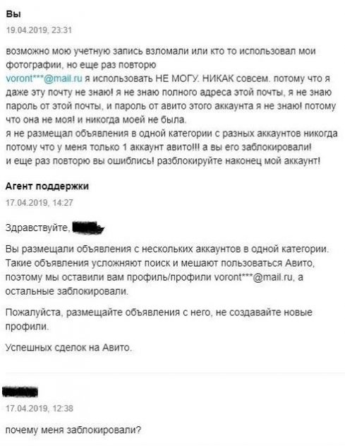 Авито утверждают, что провели проверку, итогом которой и стала блокировка аккаунта. Мужчина якобы с нескольких адресов пытался продавать одни и те же вещи. Правилами сайта это запрещено, поэтому пользователя быстро «закрыли». В переписке с поддержкой россиянин изо всех сил пытается доказать, что судя по всему стал жертвой мошенников. Однако Авито упорно настаивает на своем. Более того, мужчине запретили создавать новые адреса, но не объяснили, как пользоваться чужой почтой.