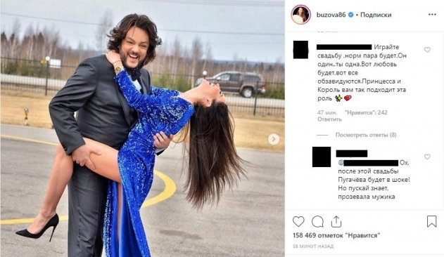 «Он один... Ты одна. Вот любовь будет, вот все обзавидуются. Принцесса и Король, вам так подходит эта роль», «Ох, после этой свадьбы Пугачёва будет в шоке! Но пускай знает, прозевала мужика», - заявили подписчики в микроблоге Бузовой.