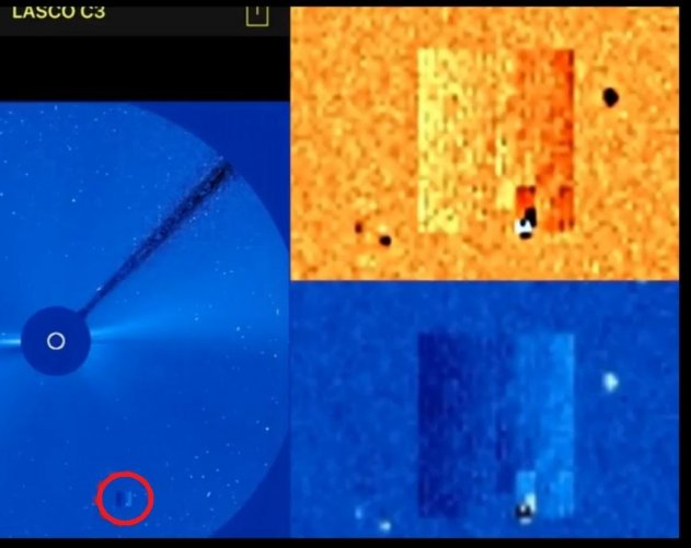 Необычный объект обнаружил уфолог Скотт Уоринг, исследовавший снимки NASA. На фоне Солнца отчетливо виден квадратный объект, природу которого ученые не могут объяснить. Уфологов привлекла форма НЛО – квадрат был правильной геометрической формы, а в правом нижнем углу было нечто, направленное в сторону Земли.