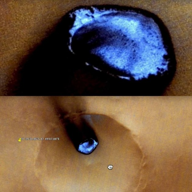 Альтернативные ученые обнаружили необычный артефакт на поверхности красной планеты. Круглый объект синего цвета находится в центре марсианского кратера, а почва рядом покрыта черной пылью, похожей на следы воздействия температуры.