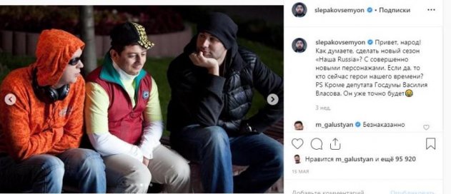 На возрождение самого известного скетч-шоу в России, «Наша Russia», намекнул в своём Instagram Семён Слепаков. Он попросил подписчиков накинуть ему идей, «героев нашего времени», способных стать персонажами сериала.