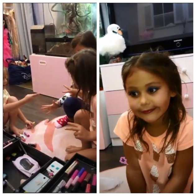 Вероятно, Самойлова не в первый раз развлекается с детьми таким способом, так как старшая дочь – Ариэла, уже четко знает правила и подсказывает своей сестре, как нужно действовать: косметику нельзя открывать, красить девочек должна только мама.