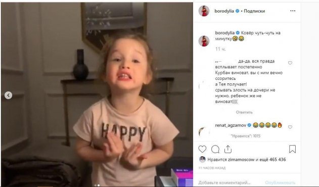 По словам старшей дочери Маруси, на ковре осталось маленькое пятнышко. Похоже, Бородина «перегнула палку» с воспитательным моментом. Судя по всему, Бородина серьезно рассорилась с супругом из-за его необдуманного поступка. Не исключено, что именно из-за ссор с мужем телеведущая «срывает злость» на дочери. Как считают фанаты, виноват в злости Бородиной ее муж Курбан, а Тея из-за него получает на себя порцию гнева. Срываться на дочери, уверенны комментаторы, явно не стоит, ведь даже злость на супруга не должна стать причиной для наказания ребенка.