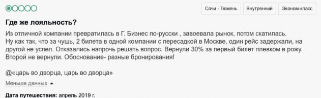Клиент до сих продолжает разбираться с этим вопросом, однако к успеху они не приводят. У молодого человека сложилось впечатление, что реклама отличных условий и услуг «Аэрофлота» существует только на словах и не более, а о лояльности к клиентам, о которой любит громко заявлять авиакомпания, не может быть и речи.