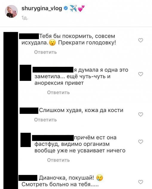 Диана опубликовала в Instagram фотографию с аэропорта, где радовалась отличному перелёту. Однако фанаты Шурыгиной стали изрядно переживать за здоровье своего кумира: «Слишком худая», «Дианочка, покушай! Смотреть больно…».
