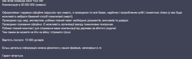«Делаем полный комплект для получения вами компенсации от государства за убитого родственника! Тем самым вы можете не идти на войну и получить деньги. Стоимость услуги: 10 тысяч долларов», – такие объявления обнаружили журналисты РИА Новости в даркнете.