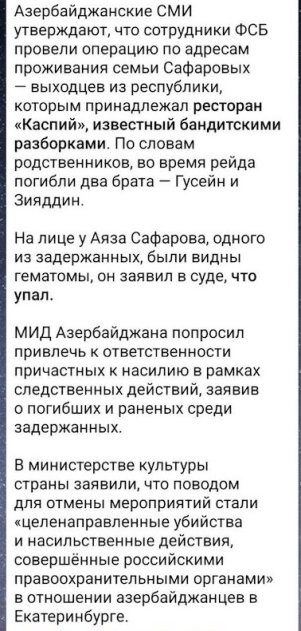 Коротко: ФСБшники жестко задержали выходцев из Азербайджана, владельцев криминального кафе, из Екатеринбурга за старые убийства (другого азербайджанца, к слову) и провели обыски, двое при задержании погибли (один от сердечного приступа, второй непонятно от чего), остальные получили синяки и разные травмы.