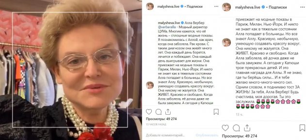 Стоит отметить, что в сети нет никаких подробностей по поводу того, как чувствует Вербер в настоящее время. Однако Малышева в своем поздравлении, видимо, дала понять, что директор ЦУМа не до конца победила болезнь. «С таким диагнозом она живёт много лет. Она каждый день борется, лечится и побеждает. Она каждый день выигрывает для жизни», - отметила Елена Васильевна.