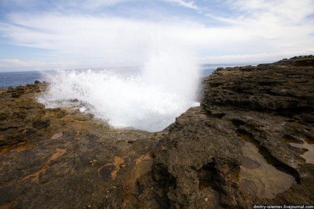 Здесь мощные океанские волны разбиваются о скалистый берег, вытесненные из пещеры внизу. Стоя над обрывом, можно долго любоваться фонтанами брызг, кипящими под ногами. В их каплях переливаются радуги, возникающие в самых неожиданных местах.
