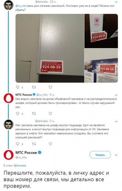 Так, реклама сотового оператора МТС взбесила одного из пользователей в Сети. Мужчина опубликовал микропост, к которому прикрепил несколько фотографий своего подъезда, где видна реклама сотового оператора. Свое обращение он опубликовал на стене и направил сотовому оператору.