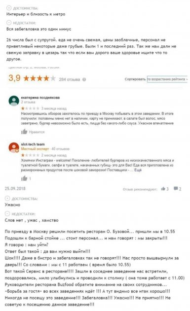 Огромное количество отзывов на просторах сетей, однако, Бузову отнюдь не волнуют. Девушка успешно строит карьеру певицы, ведущей и не вылезает из телевизионных экранов по всей стране. Рестораны же для нее, вероятно, возможность «левого» заработка, а потому об их качестве она решила не заботиться.