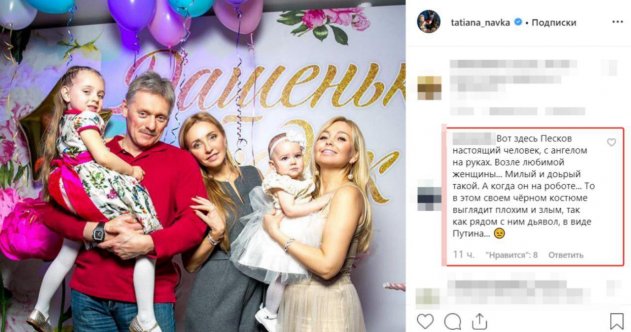 Под последним постом Татьяны Навки в Instagram, где она позирует с мужем и ребёнком, комментаторы назвали её мужа, пресс-секретаря президента Дмитрия Пескова, «милым и добрым настоящим человеком».