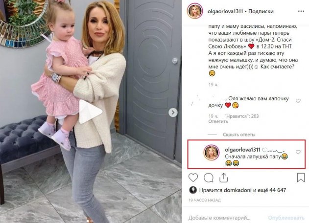 Недавно Орлова побывала в гостях у семейных участников телестройки – Ольги Рапунцель и Дмитрия Дмитренко. Певица опубликовала видео, где держит на руках маленькую дочь супругов.