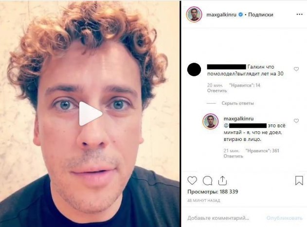 Ведущий и пародист Максим Галкин решил сегодня «помучить» всех своих подписчиков, которые пытаются похудеть к лету – прямо перед камерой он икру минтая с майонезом мазал на хлеб и кушал. Но в комментариях к видео комика никто не ругал за провокацию к срыву диеты, зато многие восхитились тем, что хоть, он и разменял пятый десяток, но выглядит лет на 30, не больше. В этот раз Максим решил раскрыть тайну своей молодости, и шокировал буржуйскими замашками фанатов: «Это всё минтай – я, что не доел, втираю в лицо».