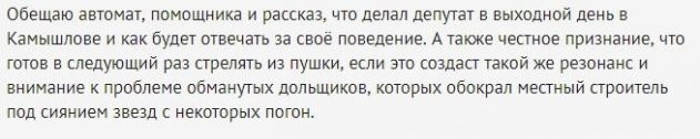 Камышловский «стрелок» признался, что после этого инцидента ему поступали звонки из прокуратуры, в которых недвусмысленно намекали, что нардепу лучше оставить затею защищать обманутых дольщиков и прекратить нападки на застройщика. Кроме того, депутата не выпускали из города ГИБДД и ДПС на пяти автомобилях.