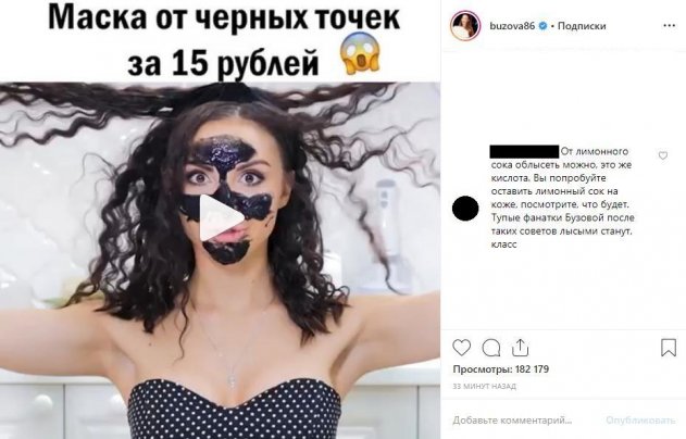 «Фанатки лысыми станут» - пишет один из комментаторов о методе, с помощью которого рекламируемая певицей блоггерша предлагает остановить выпадение волос. Для этого метода она использовала свежевыжатый лимонный сок, который не только разбрызгивала на волосы без смывания, но ее и втирала в кожу головы. Таким странным методом предлагалось остановить выпадение волос «за один день», но пользователь соцсети отметил, что лимонный сок это все-таки кислота, а ее реакция с кожей очень непредсказуемая. Впрочем, странно, что проблемы этого видео замечают именно комментаторы, а не сама Бузова. Неужели ей вообще все равно, какие советы показывают в рекламируемом ей видео, и как они может навредить ее же поклонницам?