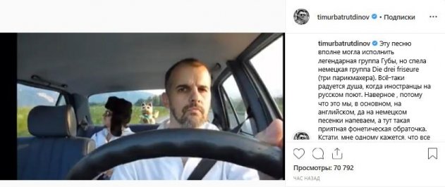 Недавно популярный резидент Comedy Club Тимур Батрутдинов опубликовал новое видео у себя в профиле Instagram. На видео он представил песню немецких исполнителей, который поют на русском языке. Также он сообщил, что данная песня «застряла» в его голове. Комик нелепо высказался о русских исполнителях.