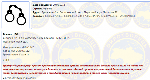 Коваленко – фигурант базы данных «Миротворец». По информации источника, раненый — снайпер ДРГ 4-ой мотострелецкой бригады НМ МО ЛНР. Позывной: Локи, Дым.