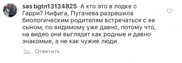 «А кто это в лодке с Гарри? Нифига, Пугачева разрешила биологическим родителям встречаться с ее сыном, по видимому уже давно, потому что, на видео они выглядят, как родные и давно знакомые, а не как чужие люди», — комментирует публикацию один из подписчиков семьи Галкиных.