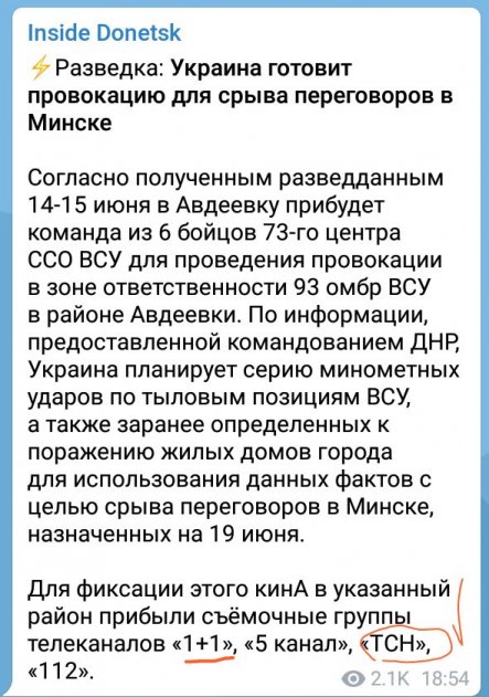 На одном из пропагандистских каналов в Телеграм появилась «срочная новость» о том, что украинские ССО якобы планируют провокации в Авдеевке, цель которых — сорвать Минские переговоры, назначенные на 19 июня. Источником лживого сообщения указано командование «днр».