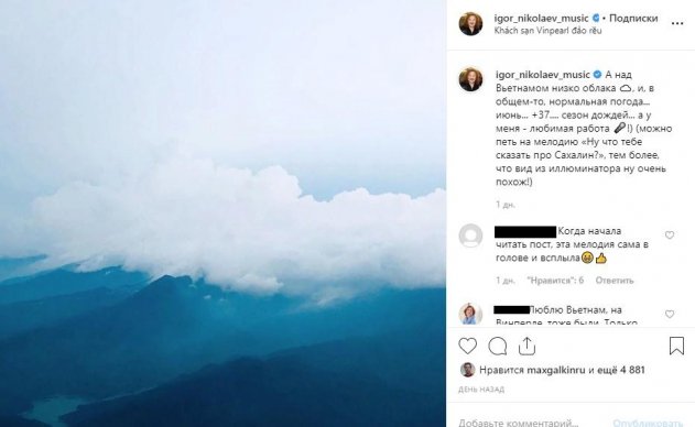 Так, на его личной странице в Stories появились несколько видео, из-за которых стало ясно, что последний накануне выступил в Юрмале с концертом. После этого в его аккаунте появилось фото, сделанное с высоты птичьего полета, очень похожее на то, какое вчера у себя в профиле разместил Николаев, когда летел во Вьетнам.