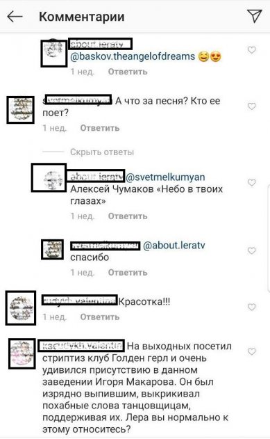 «На выходных посетил стриптиз клуб Голден герл и очень удивился присутствию в данном заведении Игоря Макарова. Он был изрядно выпившим, выкрикивал похабные слова танцовщицам, поддерживая их. Лера вы нормально к этому относитесь?», - написал очевидец на странице Валерии.