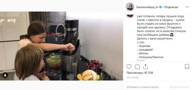 На записи дети устраивают эксперименты с фруктами, ягодами и овощами, делая из различных сочетаний этих продуктов сок. Не секрет, что некоторые ингредиенты при смешивании могут дать «жидкие» последствия в виде частого посещения уборной, особенно для неокрепшей детской пищеварительной системы. Так, в первом типе сока содержатся одновременно петрушка, базилик, морковь, яблоко и сельдерей – не самое простое сочетание для желудка. Таким образом получается, что Барановская буквально «дарит» своим детям в игровом якобы формате настоящую диарею, или, как минимум, риск ее возникновения. Что это, незнание элементарных основ приема пищи или игра на камеру?